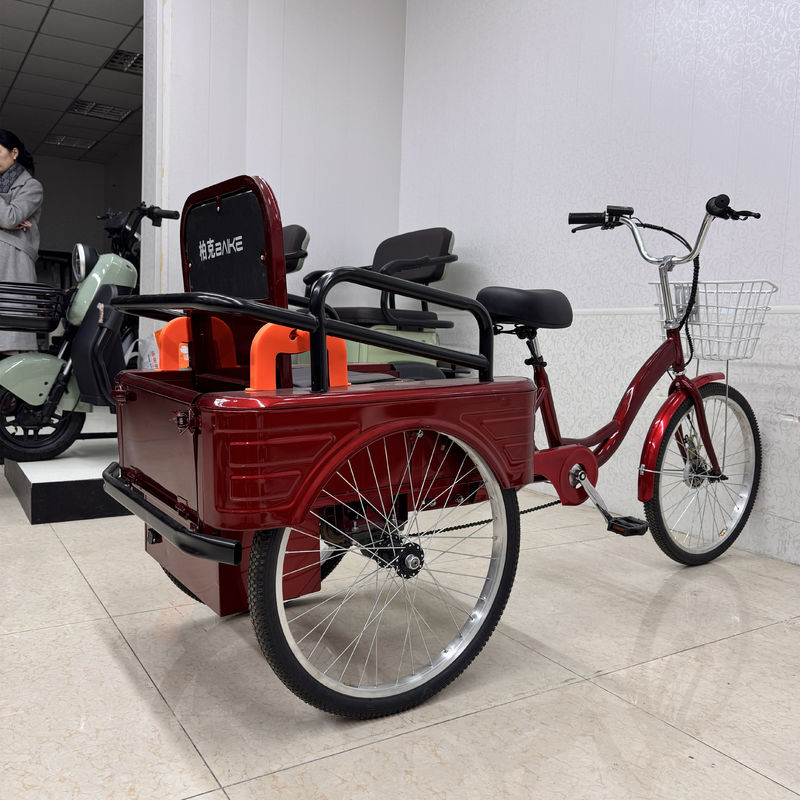Designed specifically for family use, this leisure tricycle retains the classic style while adding child safety seat interfaces. The burgundy body with smooth lines makes it a beautiful sight whether on city streets or country roads.